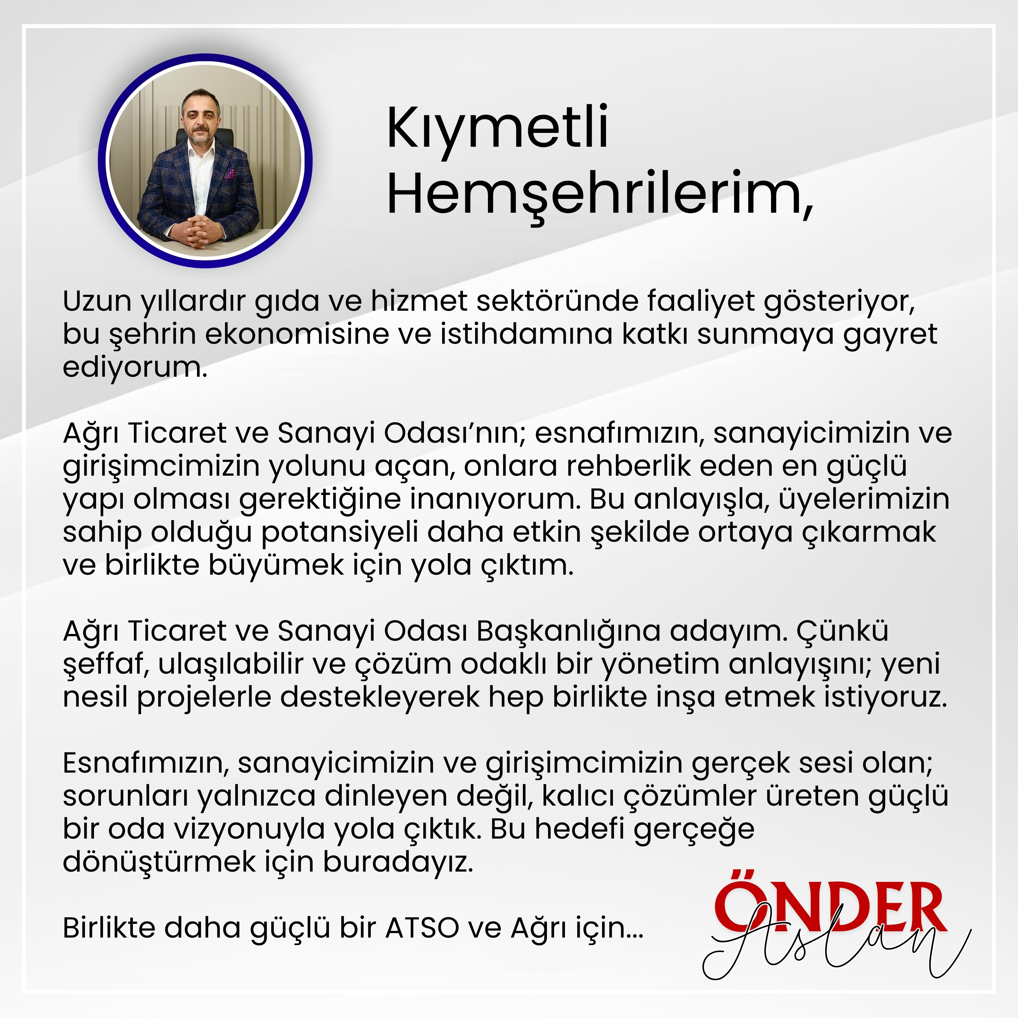 Ağrı Ticaret ve Sanayi odasının, esnafımızın, sanayicimizin ve girişimcimizin yolunu açan, onlara rehberlik eden en güçlü yapı olması gerektiğine inanıyorum. Bu anlayışla, üyelerimizin sahip olduğu potansiyeli daha etkin şekilde otaya çıkarmak ve birlikte büyütmek için yola çıktım. Ağrı Ticaret ve Sanayi Odası Başkanlığına adayım. Çünkü, şeffaf, ulaşılabilir ve çözüm odaklı bir yönetin anlayışını; yeni nesil projelerle destekleyerek hep birlikte inşa etmek istiyoruz. Esnafımızın, sanayicimizin ve girişimcimizin gerçek sesi olan sorunları yalnızca dinleyen değil kalıcı çözümler üreten güçlü bir Oda vizyonuyla yola çıktık. Bu hedefi gerçeğe dönüştürmek için buradayız.
